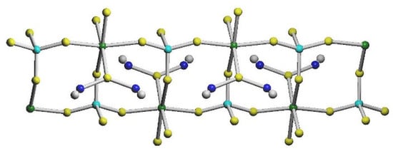A number of 1D thiocyanato bridged heterometallic complexes are known, among them [{M(en)2}{Pt(SCN)4}]n (M = Ni, Cu) [23]. Cis and trans fashion at the [Pt(SCN)4]2− bridging unit occurs in two forms of the copper(II)–platinum(II) compound. On the other hand, nickel(II)–platinum(II) compound occurs only in the cis form. The one-dimensional [Cu(en)(µ1,3-NCS)4Hg]n compound consists of ladder-like zigzag ribbons with three different, {Cu(en)(µ1,3-NCS)2Hg}, ({Cu(en)(µ1,3-NCS)2Hg})2 and ({Cu(en)(µ1,3-NCS)3Hg})2, macrocycles [24]. Three different types of 1D chain crystal structures in the [Cu(diamine)2Zn(NCS)4]n·n(solv) (diamine = en, pn) systems have been described, namely zigzag, helical or quasi-linear [25,26,27]. Additionally, two modes of thiocyanate bridges, µ1,3-NCS (more common) and µ1,1-SCN, have been found among these compounds. A series of 1D ferrimagnetic systems have been reported for coordinated polymers based on [Mo(NCS)6]3− in combination with nickel(II) and cobalt(II) complexes [28].