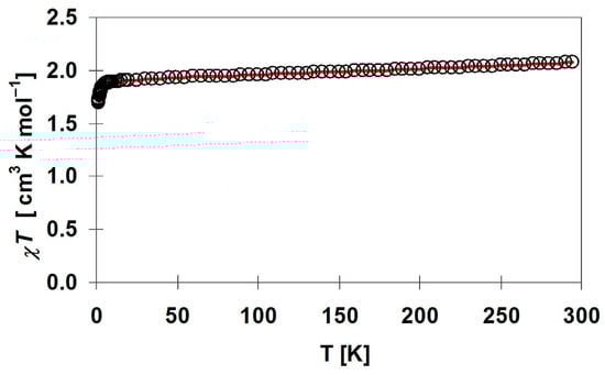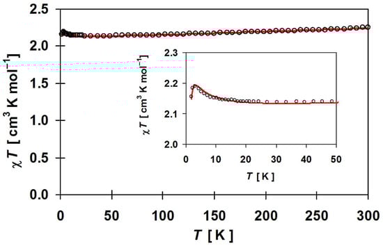 The plot of χT for 2 is given in Figure 13. The χT(T) curve in the whole measured range obeys the Curie–Weiss law in the whole measured range with C = 2.049 cm3 mol−1 K and θ = −1.93 K. The value of χT at 295 K is equal to 2.07 cm3·mol−1·K (4.06 B.M.), which is slightly bigger than the value (1.75 cm3·mol−1·K) expected for two uncoupled Cu(II) ions (0.75; S = 1/2; g = 2.0) and one Ni(II) ion (1; S = 1; g = 2). Cu(I) ion is diamagnetic and gives no contribution to the magnetism except for the negligible contribution to the diamagnetic correction. The χT product decreases slowly with temperature to 10 K and then more rapidly reaches 1.69 cm3·mol−1·K at 1.8 K. The small decrease up to 10 K can be caused by measurement inaccuracies due to small spins or temperature-independent paramagnetism, especially for Ni(II) ions [101,102], while the rapid lowering of the χT product below 10 K can be caused by antiferromagnetic interactions through thiocyanate bridges and zero-field splitting for Ni(II). This is supported by the negative Weiss constant.