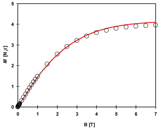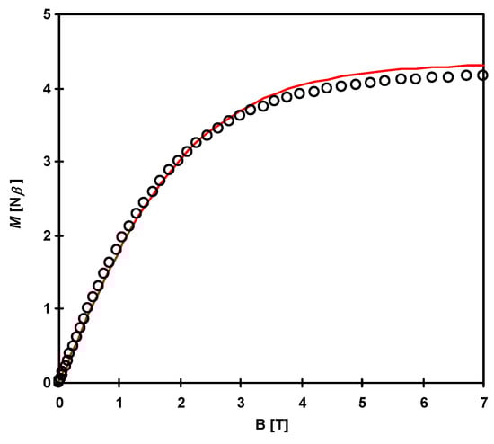 Field dependence of the magnetization for 1 at 1.8 K. The solid red line is the best fit for the model described in the text.