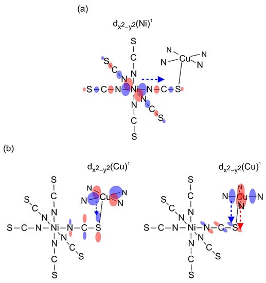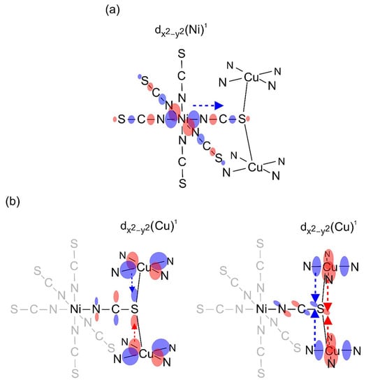 Schematic representation of spin density delocalization from the dx2−y2 orbital of Ni(II) onto the σ(SCN−) system (a) and from the dx2−y2 orbital of Cu(II) onto the π(SCN−) system (b) in 2. The magnetic interaction Cu-Ni paths in 2 are similar to that of 1 depicted in Figure 12. However, due to significant overlap of natural magnetic orbitals of Cu(II) systems of end-on thiocyanato-bridged Cu(II) moieties (dCu-S ca. 2.36 Å) (b), the Cu-Cu antiferromagnetic interaction prevailed in 2, as was shown by the fit of magnetic data.