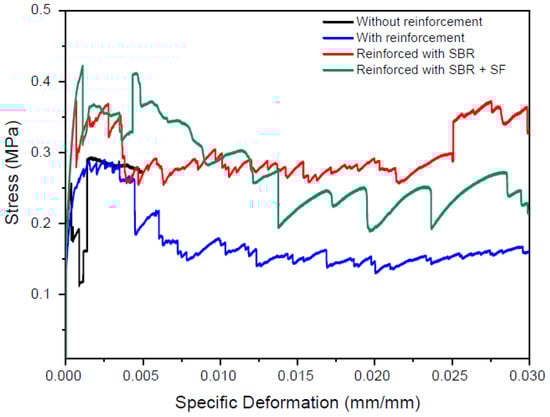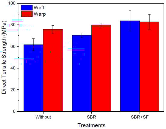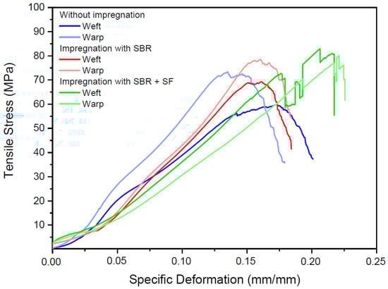 - Average maximum stress in the warp direction had more satisfactory performance for both untreated and SBR impregnated textiles. In the case of SBR + SF impregnated textiles, the maximum stresses in the warp and weft directions were equivalent. This was considered to be a positive result which would allow the use of textile waste with difficult identification of weave direction.