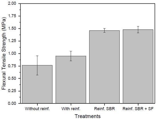 - Flexural tensile strength presented increases of 92.10% and 94.73% for composites with SBR and SBR + SF impregnated reinforcement, respectively, when compared to unreinforced composites. Comparison of the same two impregnated reinforcement composites with untreated reinforced samples yielded increases in strength of 53.68% and 55.78%, respectively.