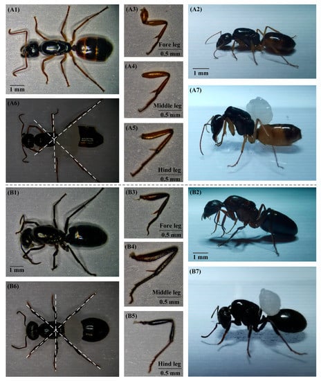 Body structure of ants. (A1) Top view of black-gold Turkish Camponotus in the static morphology. (A2) Side view of black-gold Turkish Camponotus in the static morphology. (A3) Magnified fore leg of black-gold Turkish Camponotus. (A4) Magnified middle leg of black-gold Turkish Camponotus. (A5) Magnified hind leg of black-gold Turkish Camponotus. (A6) Top view of black-gold Turkish Camponotus in the load-carrying morphology. (A7) Side view of black-gold Turkish Camponotus in the load-carrying morphology. (B1) Top view of Messor structor in the static morphology. (B2) Side view of Messor structor in the static morphology. (B3) Magnified fore leg of Messor structor. (B4) Magnified middle leg of Messor structor. (B5) Magnified hind leg of Messor structor. (B6) Top view of Messor structor in the load-carrying morphology. (B7) Side view of Messor structor in the load-carrying morphology.