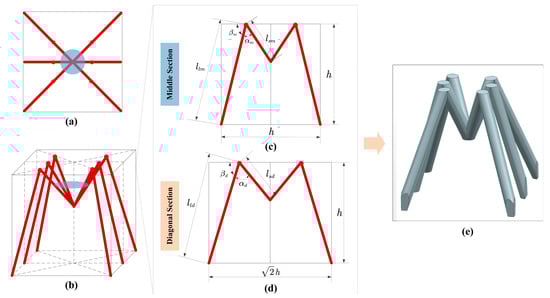 Inspired by ants, the lattice structure is designed with a total of 12 sides, including six short sides and six long sides, as depicted in Figure 2a,b. The short side ls corresponds to the femur of an ant, and the long side ll corresponds to the tibia of an ant. The left front leg and the right hind leg, on one hand, and the right front leg and the left hind leg, on the other, are respectively on the diagonal section of the cube, and the left middle leg and right middle leg are on the middle section of the cube. In order to simplify the model, it is assumed that the left front leg and the right hind leg, on one hand, and the right front leg and the left hind leg, on the other, have the same parameters: the length of the short side lsd, the length of the long side lld, the angle between the short side and the long side αd, and the angle between the long leg and the horizontal axis βd, where the subscript d represents the diagonal section, as exhibited in Figure 2d. Correspondingly, the short side, the long side, the angle of the left middle leg and the right middle leg, and the angle between the long leg and the horizontal axis are lsm, llm, αm and βm, respectively, where the subscript m represents the middle section, as exhibited in Figure 2c.