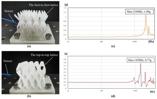 Vibration experiment. (a) The top-to-top lattice, (b) sweeping curve of the top-to-top lattice, (c) the foot-to-foot lattice, and (d) sweeping curve of the foot-to-foot lattice.