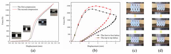 Compression experiment. (a) Material compression experiment diagram; (b) compression experiment diagram of two samples; (c) compression process of the top-to-top lattice sample at the displacement of 0.5 mm, 1 mm, and 1.5 mm; and (d) compression process of the foot-to-foot lattice sample at the displacement of 0.5 mm, 1 mm, and 1.5 mm.