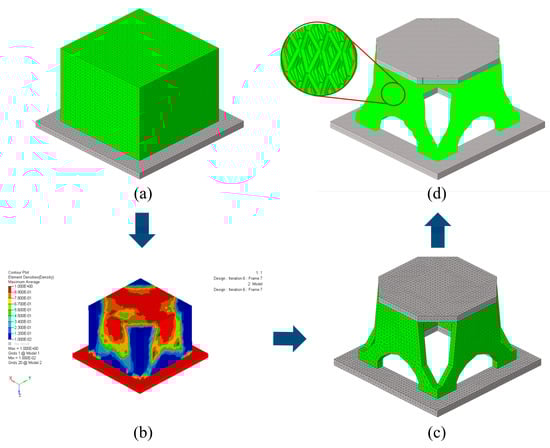 Design and optimization process of the solid-lattice hybrid support structure. (a) The finite element model of the initial design, (b) the topology optimization result, (c) the reconstructed model of the topology optimization model, and (d) the solid-lattice hybrid optimization model.
