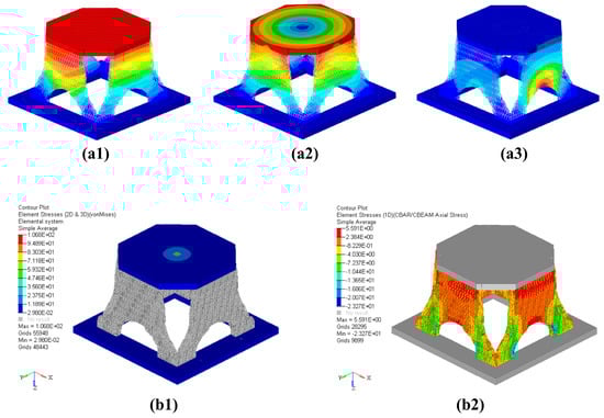 Simulation analysis result graph. (a1) First-order mode diagram, (a2) second-order mode diagram, (a3) third-order mode diagram, (b1) von Mises stress distribution of 3D elements of the reconstructed solid-lattice hybrid structure, and (b2) von Mises stress distribution of 1D elements of the reconstructed solid-lattice hybrid structure.