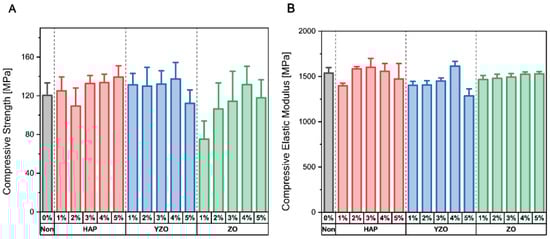 | Powder | Weight Percent | Compressive Strength [MPa] | Compressive Elastic Modulus [MPa] |