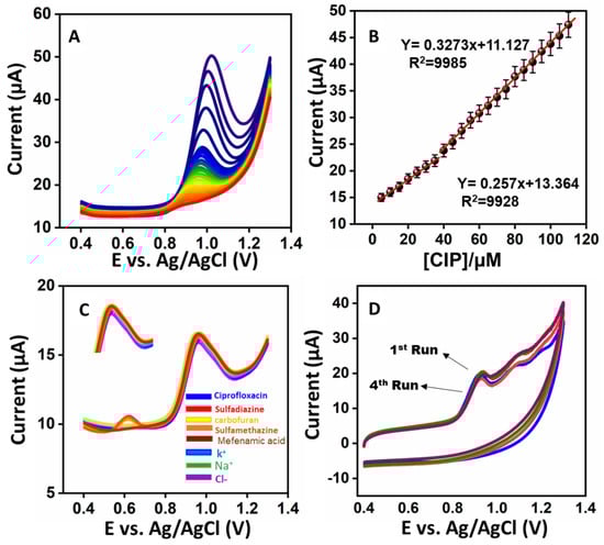 3.5. Differential Pulse Voltammetry (DPV), Interference Studies, and Repeatability of CIP