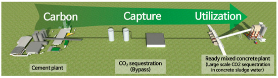 However, it is essential to increase the proportion of CSW that contains a lot of Ca2+ to maximize the amount of CO2 fixed in concrete slurry water. According to reports, Korea produces more than 30 million tons of concrete slurry water annually [27]. Therefore, it will be possible to sequestrate a significant amount of CO2 generated from the cement industry if a supercritical CO2 carbonation process capable of continuous processing in connection with concrete slurry water in a ready-mixed concrete plant through CO2 capture or bypass is developed, as shown in Figure 2.
