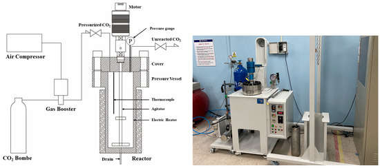 Figure 4 shows a schematic of the supercritical CO2 reactor used in this study. The supercritical CO2 reactor consists of a gas booster (Maximator, Nordhausen, Germany) and a reactor (PHOS-ENTECH, Daejeon, Korea). A heating plate (used for temperature control) and an agitator are installed in the reactor, and a thermocouple and pressure gauge are used to measure the temperature and pressure, respectively. The gas booster is connected to the air compressor and is used to pressurize CO2 gas into the reactor at a high pressure to maintain the supercritical CO2 state. The maximum operating temperature and pressure of the supercritical CO2 reactor are 80 °C and 200 bar, respectively, and the internal volume of the reactor was designed to be 4 L. The agitator’s rotation speed can be adjusted to ≤400 revolutions per minute (rpm).