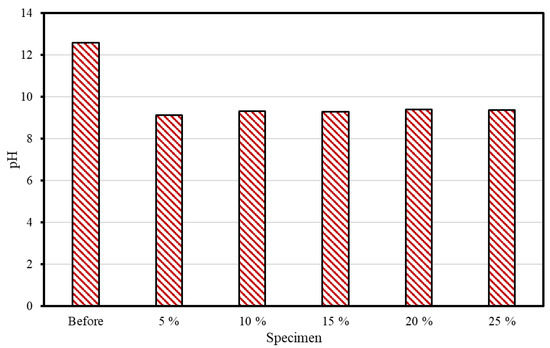 Figure 5 shows the pH measurement results before and after supercritical CO2 carbonation. The specimen’s pH was measured to be greater than 12 before the reaction, but regardless of the CSW ratio, it ranged from 9 to 9.5 after the reaction. Typically, during the cement hydration process, Ca(OH)2 is produced and the pH is increased. Ca(OH)2 is converted into CaCO3 in a CO2-containing environment that exists during the carbonation process, as shown in Equation (1), thus resulting in a pH reduction. In this study, it appears that the carbonation reaction also caused the pH of the concrete slurry water to decrease. The pH of high-purity CaCO3 is known to be 9.4. It was determined that the conversion into CaCO3 occurred because the pH of the reaction product after supercritical CO2 carbonation ranged from 9.0 to 9.5.