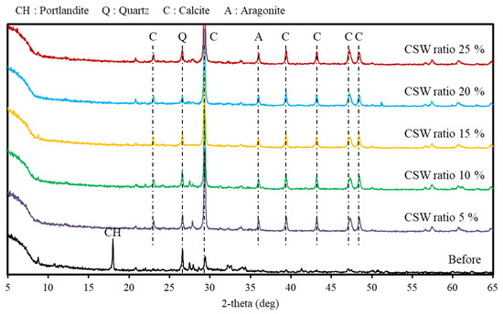 However, following the reaction, no Ca(OH)2 peak was detected, and the calcite peak was dominant in conjunction with the small aragonite peak. Additionally, similar peaks were observed regardless of the CSW ratio. CaCO3 is divided into aragonite, vaterite, and calcite depending on the crystal structure, and calcite is reported to be the most stable form [28]. Furthermore, a previous study reported that calcite is mainly formed when Ca2+/CO32− ≤ 1. It was determined that calcite was also mainly generated as a reaction product in this study because a significant amount of CO32− was generated at the supercritical CO2 condition that caused the Ca2+/CO32− ratio to decrease [24]. Meanwhile, quartz peaks could be confirmed both before and after the reaction. It was determined that this is due to the SiO2 component caused by the fine powder of the aggregate mixed in concrete slurry water [29].