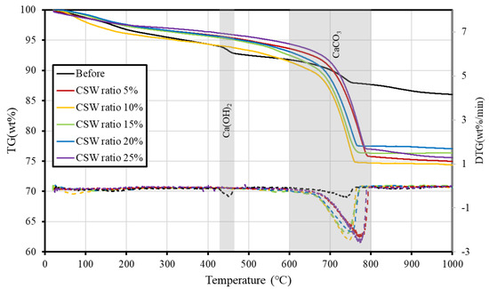Figure 7 shows the TG-DTA measurements before and after supercritical CO2 carbonation. Ca(OH)2, the main hydrate of cement, thermally decomposes between 400 °C and 550 °C, and CaCO3, which is generated following the reaction with CO2, thermally decomposes between 600 °C and 800 °C. In the TGA results, small weight losses of Ca(OH)2 and CaCO3 were observed in the sample before supercritical CO2 carbonation. However, in the samples after supercritical CO2 carbonation, the weight loss of Ca(OH)2 could not be detected, and only the weight loss of CaCO3 was confirmed regardless of the CSW ratio.
