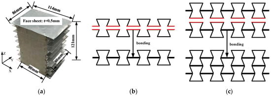 The auxetic honeycomb filled with foam concrete: (a) the specimen photo; (b) illustration of joining corrugated sheets to form auxetic honeycomb cells; (c) illustration of joining lines of cells to form auxetic honeycomb part. In (b,c), the edges in red were joined by adhesive.