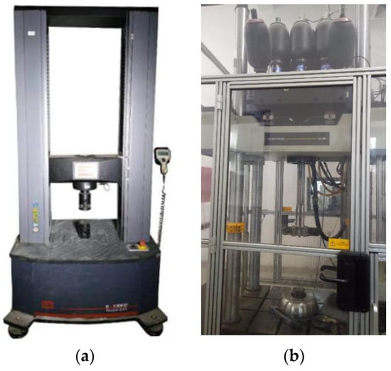 The testing machines used in the present study: (a) MTS Exceed E45 testing system; (b) INSTRON VHS160/100-20 high-speed testing system.