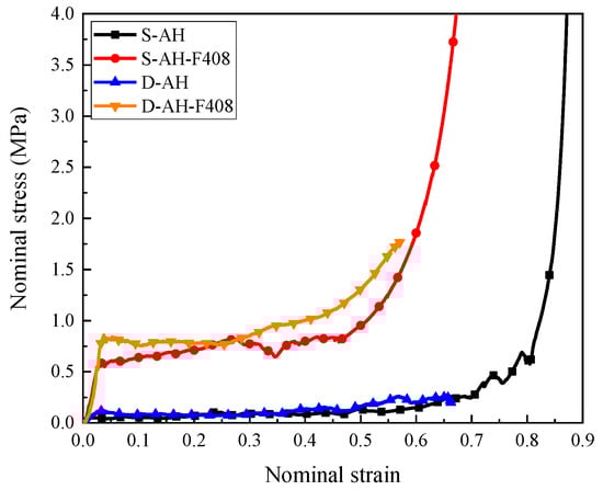 The stress–strain relationships of the specimens with different loading rates. The thickness of the honeycombs was 0.25 mm, for both the hollow and filled specimens. D in the sample index indicates the quasi-static and dynamic tests, respectively. AH represents auxetic honeycomb while F means foam concrete. For instance, D-AH-F408 represents the auxetic honeycomb filled with 408 kg/m3 foam concrete subjected to dynamic compression with 1 m/s.