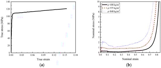 The stress–strain relationships under quasi-static loading: (a) coupon of honeycomb cell-wall material under tension of loading rate 0.5 mm/min; (b) foam concrete under compression of loading rate 0.5 mm/min.