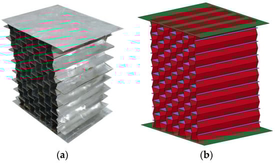 As shown in the numerical model in Figure 5, the upper and lower face plates and the aluminum honeycomb core layer were modeled with Belytschko-Tsay shell element SHELL163. This shell element is a four-node element with bending and membrane characteristics; thus, it can withstand both in-plane and out-plane loads. There are six degrees of freedom at each node, namely, three translations and three rotations in the x-, y-, and, z-direction. As shown in Figure 1, the upper and lower aluminum face plates, as well as the middle aluminum concave folded plates were bonded together with LEAFTOP1160 high-strength epoxy resin during the manufacture of the aluminum honeycomb. In both the quasi-static and dynamic compression tests, no separation was observed between the adjacent aluminum plates during the entire loading process. Therefore, in the numerical model, it was assumed that the adjacent aluminum sheets were completely bonded together during the entire deformation process, and the thickness of the adhesive layer was neglected. Therefore, in this model, the thickness of the horizontal cell wall was set to 0.5 mm while the thickness of the oblique cell wall was defined as 0.25 mm. With tensile test data of the aluminum sheet in Figure 4a, the stress–strain curve was defined by the keyword *MAT_PIECEWISE_LINEAR_PLASTICITY to describe the material properties of the aluminum honeycomb cell wall and the two face plates. Moreover, since the strain rate sensitivity of 1060 aluminum alloy was insignificant, the strain rate effect was neglected in the material model. The material parameters of aluminum in the numerical simulation are listed in Table 1.