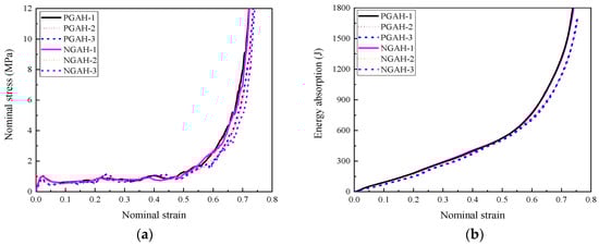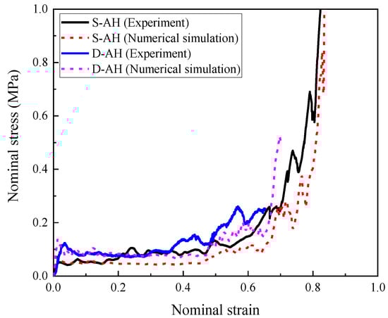 Before investigating the response of the foam concrete-filled auxetic honeycomb subjected to impact, the numerical model was validated in terms of the nominal stress–strain curve for both hollow honeycomb and that filled with foam concrete, respectively.