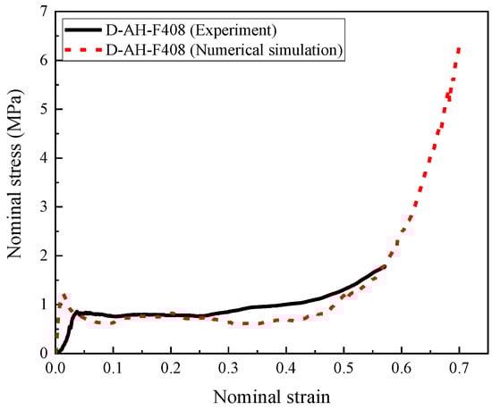 The numerical model of the aluminum honeycomb filled with 408 kg/m3 foam concrete was further verified by the test data, with the composite and numerical model shown in Figure 8. The experimental data and numerical simulation results are compared in Figure 9.