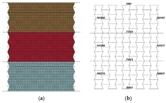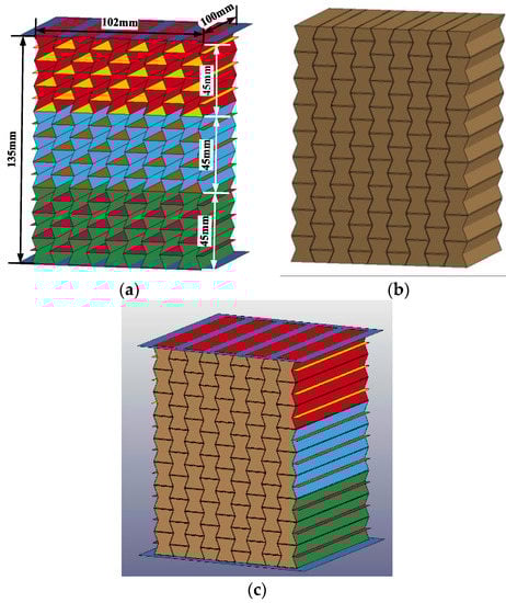 With the established numerical model of the graded composite, the numerical simulation was carried out to investigate the dynamic response of concave hexagonal auxetic honeycomb filled with foam concrete with layered cell-wall thickness gradient subjected to low-velocity impact, including the response mode, stress–strain characteristics, and energy absorption. Figure 11 shows the numerical models for the layered auxetic honeycomb and the foam concrete filler. The total height of the numerical model was 135 mm, while the width and the out-of-plane thickness of the core were 102 mm and 100 mm, respectively. As shown in Figure 11, the composite was divided into three layers, and the height of each layer was 45 mm. The density of foam concrete filler for all these three layers was 408 kg/m3, and each layer had a different thickness of cell-wall but the averaged cell-wall thickness of the graded composite remained the same as the homogenous composite.