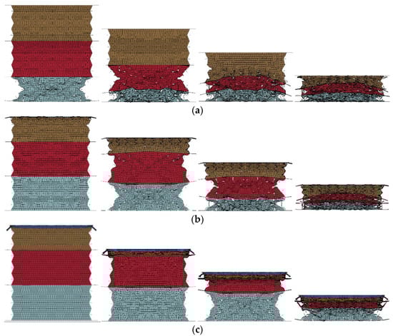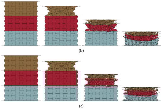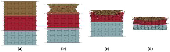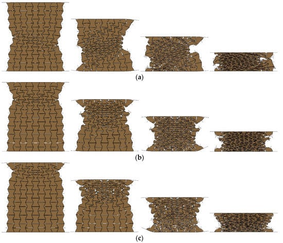 Figure 17 presents the response mode of the composite with a cell-wall thickness of 0.2 mm for all three layers subjected to compression strokes of 0, 15, 55, and 95 mm, respectively. As shown in Figure 17, the composite exhibited a significant staged response mode, and these three layers were compressed and compacted in sequence from the top layer to the bottom layer. During the initial stage of compression loading, the 0.2 mm thick cell wall was able to effectively constrain the 408 kg/m3 foam concrete filler, resulting in an obvious negative Poisson’s ratio effect in the top layer, as shown in Figure 17b. When the compression stroke reached 55 mm, uneven compression loading was transferred to the middle layer due to the material concentration in the center of the top layer by its significant negative Poisson’s ratio effect, as shown in Figure 17c. The bottom layer also had to endure uneven compression due to the sagged deformation in the center of the middle layer, when the compression stroke increased to 95 mm, as shown in Figure 17d. Due to the larger compression load in the center transferred to the middle and bottom layers, these two layers were more difficult to realize the expected negative Poisson’s ratio effect. Despite this, the lateral deformation of the foam concrete filler was significantly mitigated by the aluminum honeycomb, as shown in Figure 17c,d. The composite showed an obvious layer-by-layer compression response mode but only the top layer exhibited a significant negative Poisson’s ratio effect.