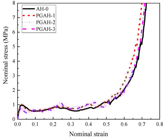 The stress–strain relationship of the composite with different cell-wall thickness gradients was compared in Figure 13, suggesting that the cell-wall thickness gradient had a negligible influence on the load-bearing capacity of the composites. Furthermore, although the homogenous and graded composite both exhibited a relatively steady stress plateau in the stress–strain curve, it was also observed that the homogeneous composite AH-0 provided a more steady stress plateau, and the stress plateau was more fluctuated with increasing cell-wall thickness gradient. The graded composite demonstrated a trend of progressive collapse-type compression deformation due to the different cell-wall thicknesses for different layers, leading to different bearing capacities in the stress plateau provided by different layers. The layer with a relatively thick cell wall provided relatively higher plateau stress compared with those with relatively thin cell walls, leading to slightly fluctuated and gradually increased stress plateau corresponding to their compression deformation mode. When the top layer with the thinnest cell wall started to compress, the middle and bottom layers remained in the elastic stage. Thus the first peak stress reflected the load-bearing capacity of the top layer. With increasing compression stroke, the crushing would occur in the middle layer when its peak stress was reached, and the same phenomenon would happen in the bottom layer. Therefore, from the stress–strain relationships of the composites with cell-wall thickness gradients, three peak stresses were observed, indicating the load-bearing capacity for these respective three layers.