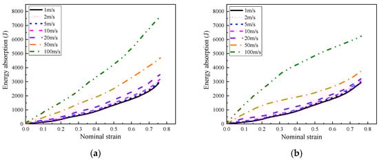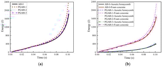 The time history of absorbed energy (1 m/s): (a) foam concrete filled auxetic honeycombs; (b) foam concrete and auxetic honeycomb.