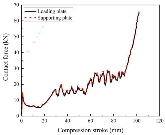The keyword *DATABASE_RCFORC output was adopted to obtain the contact force between the composite and the upper loading or lower supporting plates in Figure 18, which was applied to evaluate the load-carrying capacity. It was worth noting that the contact force between the composite and the supporting plate was also regarded as the load transferred to the protected structure, which was important data to evaluate the protection performance of the composite when it was applied as the sacrificial cladding. As shown in Figure 18, the composite with foam concrete density gradient presented three increasing plateau stresses with increasing compression stroke, corresponding to the compression deformation process of these three layers in Figure 17. It was also observed that the top layer exhibited higher initial peak stress and a more steady stress plateau mainly due to its obvious negative Poisson’s ratio effect. Differently, the middle and bottom layers demonstrated inconspicuous peak stress and fluctuated stress plateau, since the foam concrete filler in these two layers was difficult to provide steady and continuous support by the inconspicuous negative Poisson’s ratio effect. Meanwhile, the continuous crushing of cells in the middle and bottom layers would affect the loading-bearing capacity of the composite, resulting in a fluctuated stress plateau. In addition, the bearing capacity of the composite demonstrated a rapid increase after the complete densification of these three layers.