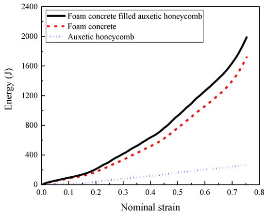 The absorbed energy by the auxetic honeycomb, foam concrete filler, and the composite is shown in Figure 19, suggesting that the foam concrete filler contributed to the majority of the energy absorption of the composite. Although the auxetic honeycomb exhibited insignificant energy absorption performance, it provided sufficient constraint for the foam concrete filler, which could effectively mitigate the brittle fracture failure of the foam concrete to significantly improve the energy absorption of the foam concrete filler.