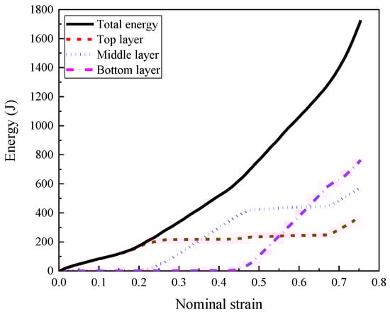 The plateau stress, densification strain, and effective energy absorption of the composite at different compression stages are listed in Table 4. The compression stage was simply determined according to the platform of the load–displacement curve in Figure 18, and the peak stress was taken as the dividing points of different compression stages in the present study. As shown in Figure 18, the nominal strain ranges of 0–0.216, 0.216–0.45, and 0.45–0.662 corresponded to the first, second, and third compression stages, respectively. Meanwhile, the observed response mode of the composite in Figure 17 shows that major deformation in the first, second, and third stages focused on the top, middle, and bottom layers of the structure, respectively. Prior to densification, the total energy absorption of the structure was 1474.39 J, while the absorbed energy at the first, second, and third stages was 243.41, 520.94, and 710.04 J, accounting for 16.51%, 35.33%, and 48.16% of the total energy absorption, respectively. It showed that the total energy absorbed at each compression stage increased with increasing foam concrete density. In summary, it was concluded that the appropriate arrangement of the foam concrete density gradient was able to realize the sequential compression response for multi-level protection.