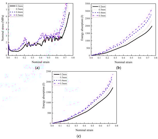 The stress–strain curves and energy absorption performance of the composites with different cell-wall thickness gradient directions are shown in Figure 15. It was found that the cell-wall thickness gradient direction had a limited effect on the load-bearing capacity under a relatively low loading rate (1 m/s in the present study). In addition, the total energy absorbed by the composite was almost the same, implying that the effect of gradient direction on their energy absorption performance was negligible, shown in Figure 15b.