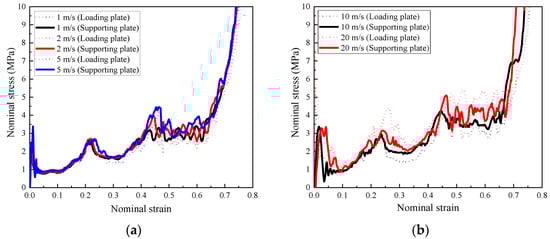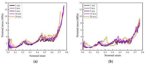 As shown in Figure 6, the numerical model of the auxetic hollow honeycomb was calibrated with the measured stress–strain curves in the quasi-static and dynamic compression tests. The experimental data and simulation results are presented in Figure 7, and it was observed that the numerical results had a favorable agreement with the experimental data, indicating that the numerical model of the hollow honeycomb could reasonably describe its mechanical performance under quasi-static and dynamic compression. It is worth noting that the nominal stress–strain curve of the dynamic test was not to the densification stage. The reason was that an adequate buffer distance was needed for the 1 m/s crosshead to stop, otherwise, the machine would be damaged.