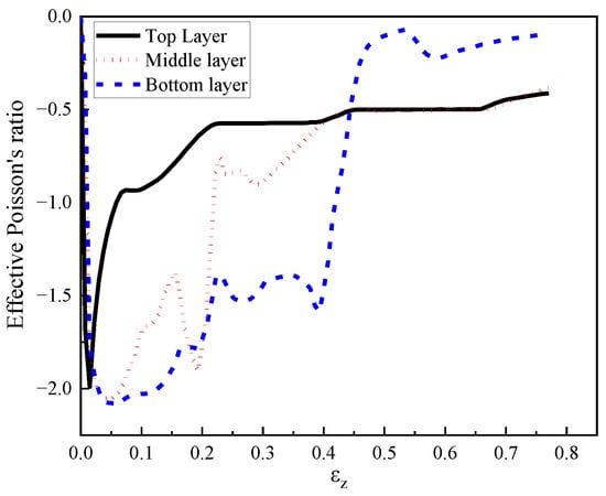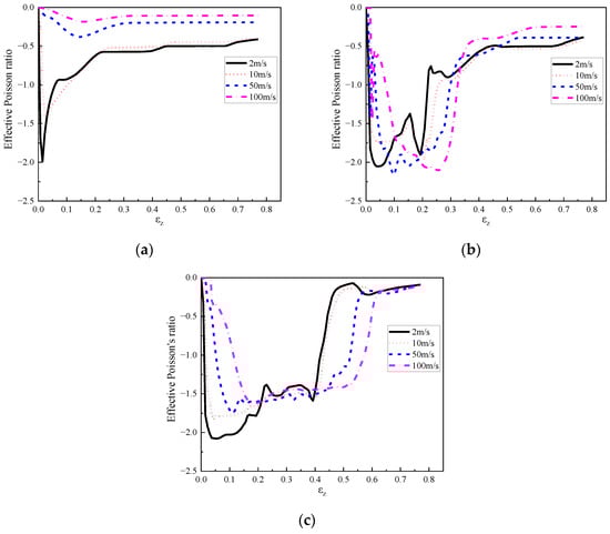 The effective Poisson’s ratio of the composite (t = 0.4:0.4:0.4 and ρ = 408:575:848) at loading rates of 2 m/s, 10 m/s, 50 m/s, and 100 m/s: (a) top layer; (b) middle layer; (c) bottom layer.