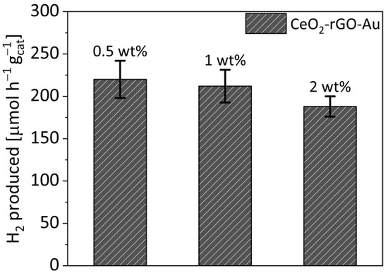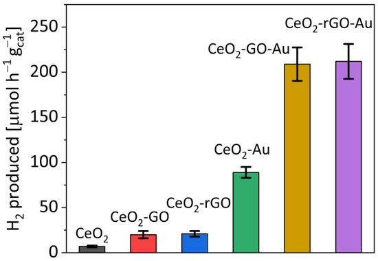 In Figure 2, the photocatalytic activity data for the other examined samples are reported. Bare CeO2 shows very low activity, with a production rate of 5 μmol gcat−1 h−1, slightly enhanced by the addition of GO or rGO (up to 20 μmol gcat−1 h−1 for both the modified samples). As reported by Christoforidis and Fornasiero [4], the activity of a semiconductor without any co-catalyst is very low, especially for materials like CeO2 that have a charge recombination rate faster than TiO2. In this context, the addition of GO on CeO2 allowed us to obtain only a slight increase in the photocatalytic activity. However, as expected, the addition of a metallic co-catalyst increases the activity up to 90 μmol gcat−1 h−1 for the CeO2-Au sample and to 210 μmol gcat−1 h−1 in the presence of GO or rGO.
