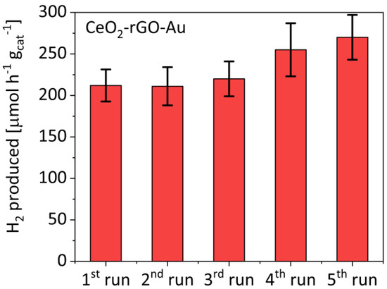 However, the photocatalytic properties of ceria can be better exploited after progressive runs. Figure 3 shows the results of five subsequent runs of the CeO2-rGO-Au catalyst. Interestingly, an increment of 60 μmol gcat−1 h−1 was observed after five runs, attributed to the progressive rGO reduction promoted by the increase in the time of solar irradiation (3 h for every run).