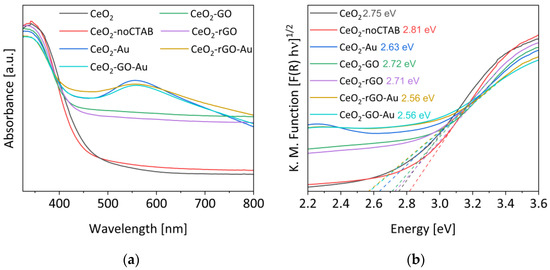 Figure 4 shows the UV-vis DRS spectra of the examined samples and their relative TAUC plots for the estimation of the optical band gaps. The absorption spectrum of the bare ceria prepared without CTAB as the templating agent is reported in panel (a). It is possible to note, according to the literature, that the presence of CTAB induces a slight bathochromic shift in the absorption band (i.e., decrease in the optical band gap) [19], and this is another positive feature of the use of the templating agent in the CeO2 synthesis. In addition, the presence of graphene oxide does not give evident variation in the band onset. In the gold-containing samples, it is possible to distinguish the signal at 556 nm due to the plasmon of the metal. According to the surface plasmon resonance (SPR) effect theory, due to the lower dielectric constant of CeO2 compared to TiO2, the position of this signal is shifted to higher wavelengths with respect to the TiO2-based samples [20,21,22]. The figure in panel (b) illustrates the TAUC plots for the previously discussed samples. The smallest band gaps are obtained with the CeO2-rGO-Au and CeO2-GO-Au samples (2.56 eV). Analogously, no substantial differences were detected between the CeO2-GO and the CeO2-rGO samples (2.72 eV and 2.71 eV, respectively).