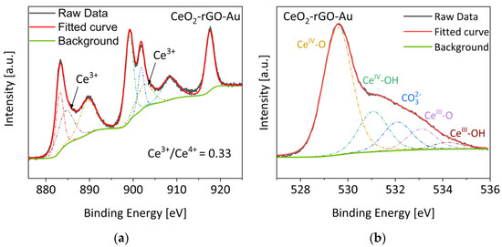 Finally, the Ce 3d and O 1s XPS analyses for the CeO2-rGO-Au sample are reported in Figure 7, while the XPS analyses of the other samples are reported in Figure S4 and Table S1.