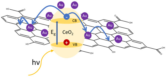 It is important to note that the proposed photoreduction preparation required the occurrence of similar reactions of the photoreforming process. The first reaction (2) is the formation of the charge carriers, and subsequently the holes (h+) in the valence band (VB) of ceria react with the sacrificial agent (ethanol in the case of the photoreduction method, glycerol in the photoreforming reaction) to promote the charge carrier separation (3). In this way the excited electrons in the conduction band (CB) of ceria are able to reduce the gold precursor (4) and/or the GO to rGO (5) (Figure 8).