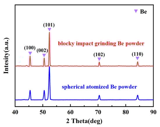 The blocky impact grinding beryllium powder and spherical atomized beryllium powder were used as the reinforcement, and the 2024 aluminum alloy was used as the matrix to prepare two kinds of Be/2024Al composites. The chemical composition of the raw materials is shown in Table 1. Figure 2 shows the morphologies and particle size distributions of the two kinds of beryllium powders. The beryllium powder prepared by impact grinding is blocky, there are triangular prism-like and round shape particles among the powders (Figure 2a), microcracks are observed on the surface of beryllium particles (marked with yellow arrows in Figure 2b), and the average particle size is about 27.9 μm (Figure 2c); the beryllium powder prepared by atomization has a regular spherical shape and a smooth surface (Figure 2d,e) with an average particle size of about 17.2 μm (Figure 2f). Figure 3 shows the XRD patterns of the two beryllium powders, neither of which has obvious impurity phase.