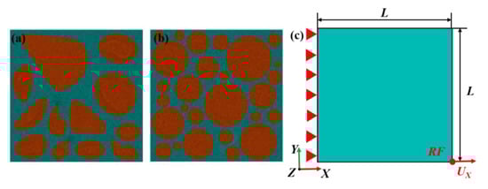 The 2D representative volume elements (100 μm × 100 μm) were used to represent the microstructure of the composites (Figure 4). A multi-particle model with a particle volume fraction of 53%, which was close to the actual microstructure of blocky-Be/2024Al composite, was established by an algorithm based on Voronoi diagrams. The model of spherical-Be/2024Al composite was drawn manually according to the actual microstructure, and the particle volume fraction was 63%. As for the finite element discretization, the matrix and beryllium particles were meshed by using the linear two-dimensional element CPE3 in ABAQUS. A 1 μm fine mesh discrete geometric model was used. Moreover, cohesive element (COH2D4) was inserted into the interface to explain the interface behavior between matrix and particles. These RVE models were generated in the XYZ Cartesian coordinate system. No periodic boundary conditions were applied. The fixed region X = 0 was fixed in 6 degrees of freedom, and the motion region X = L constrained by the reference point “RF” could only move along the loading X-direction on the UX degree of freedom. A displacement loading of U = 0.05 L was applied on the “RF” (Figure 4c).