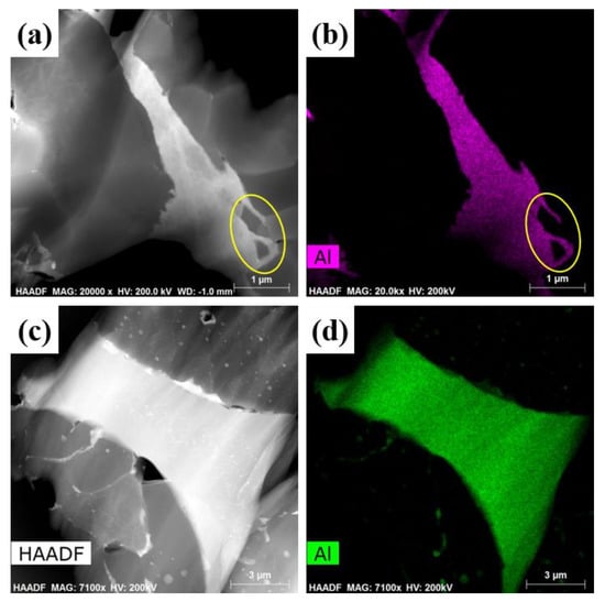 TEM photographs of two kinds of Be/2024Al composites fabricated with different beryllium powders. (a) Typical HAADF image of the blocky-Be/2024Al composite; (b) the corresponding Al element distribution of (a); (c) typical HAADF image of the spherical-Be/2024Al composite; (d) the corresponding Al element distribution of (c).