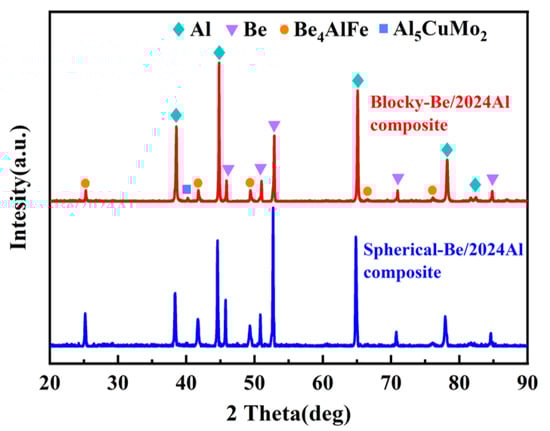 In addition, in the SEM images of the microstructures of the two composites at high magnification (Figure 5b,d), a white impurity phase exists near the beryllium particles. According to the XRD phase composition analysis (Figure 7), it can be determined that the impurity phase in the two composites is the Be4AlFe phase, and the content of impurity phase in the spherical-Be/2024Al composites is higher. The formation of the Be4AlFe phase may be related to the Fe content of beryllium powder and Al matrix (Table 1). The Be4AlFe phase is a common impurity phase in beryllium. Fe can be solid dissolved in Be, and the binary beryllium iron phase can combine with free Al to form Be4AlFe [10]. Due to the relatively low content of the impurity phase in the raw beryllium powder, it cannot be detected by XRD. However, due to the introduction of Fe from the Al matrix, and the higher content of Fe in the spherical beryllium powder compared to that in the blocky beryllium powder, the Be4AlFe phase in the spherical-Be/2024Al composite is more than that in the blocky-Be/2024Al composite. The impurity phase that mainly exists at the interface of beryllium phase and aluminum phase may also affect the mechanical properties of the composites. Moreover, a slight Al5CuMo2 phase diffraction peak is observed in the XRD pattern. The Al5CuMo2 phase is the precipitated phase in the matrix. Since Mo does not exist in the matrix alloy and beryllium reinforcement, the Mo element may be the impure element introduced in the preparation process. Due to the small content, only the strongest diffraction peak of the Al5CuMo2 phase is detected in the XRD pattern.