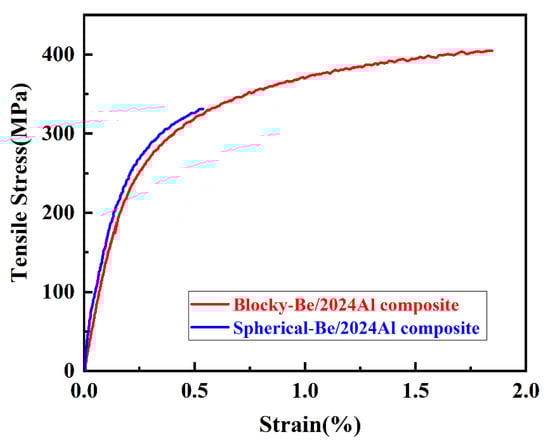 Figure 8 shows the typical tensile curves of blocky-Be/2024Al composites and spherical-Be/2024Al composites. Table 4 lists the specific values of mechanical properties of these two composites. The hardness and yield strength of blocky-Be/2024Al composites are slightly lower than those of spherical-Be/2024Al composites. This is because the beryllium content of the blocky-Be/2024Al composites is slightly lower than that of the spherical-Be/2024Al composites. However, its tensile strength and elongation are 405 MPa and 1.58%, respectively, which are higher than 331 MPa and 0.38%, respectively, of the spherical-Be/2024Al composites.