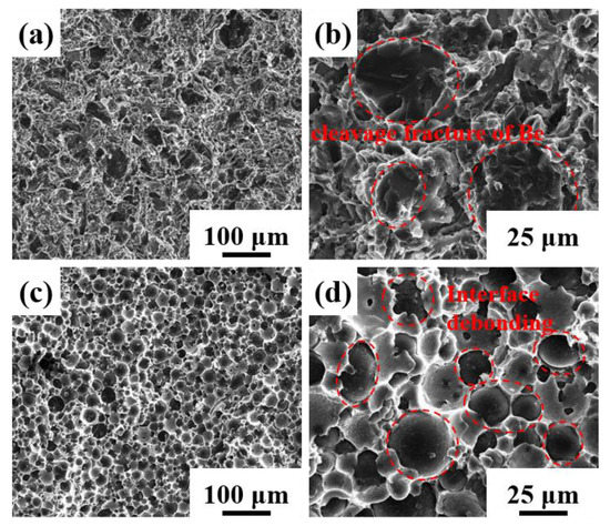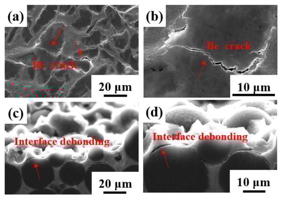 Meanwhile, the cross-section of the tensile fracture specimens of the composites is observed, and the typical microstructures are shown in Figure 13. The microcracks in the blocky-Be/2024Al composite mainly appear inside the beryllium particles (Figure 13a,b); the microcracks in the spherical-Be/2024Al composite are mostly present at the beryllium–aluminum interface, and obvious debonding can be observed, while the beryllium particles are hardly broken (Figure 13c,d). These observed results are consistent with the simulation results in Figure 10 and Figure 11.