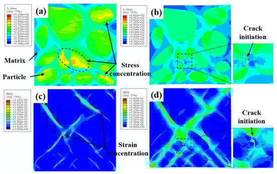 Figure 10 shows the Mises stress and equivalent plastic strain distribution of the blocky-Be/2024Al composite at different strain stages. As shown in Figure 10a,c, in the initial stage of tension, the distribution of stress and strain is not uniform, and the high stress area is mainly concentrated on beryllium particles, especially cluster particles and particles with sharp corners (marked by the black dotted circle in Figure 10a). The strain is mainly concentrated in the matrix and presents an angle of about 45° from the loading direction, and the strain is also prominent at the particles with sharp angles. Subsequently, with the accumulation of deformation, beryllium particles begin to fail during the tensile process, forming microcracks (Figure 10d), and the stress on both sides of the crack is significantly released (Figure 10b).