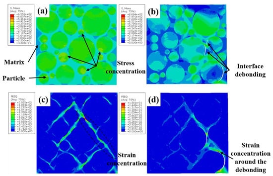 The Mises stress and equivalent plastic strain distribution of the spherical-Be/2024Al composites at different strain stages are shown in Figure 11. Similar to the blocky-Be/2024Al composites, in the initial stage, stress concentration of the composite is mainly in the beryllium particles, and the small particles bear higher stress (Figure 11a), while the strain is mainly concentrated in the aluminum matrix, the stress concentration zone and the loading direction is about 45°, and there is a high degree of strain concentration in the aluminum matrix between the adjacent beryllium spheres (Figure 11c). With the increase in deformation, debonding occurs at the beryllium–aluminum interface, resulting in microcracks, and the strain is highly concentrated along the debonding interface, which eventually leads to a complete debonding of the interface.