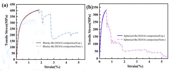 Comparison of the stress–strain curves between numerical and experimental results. (a) Blocky-Be/2024Al composite; (b) spherical-Be/2024Al composite.